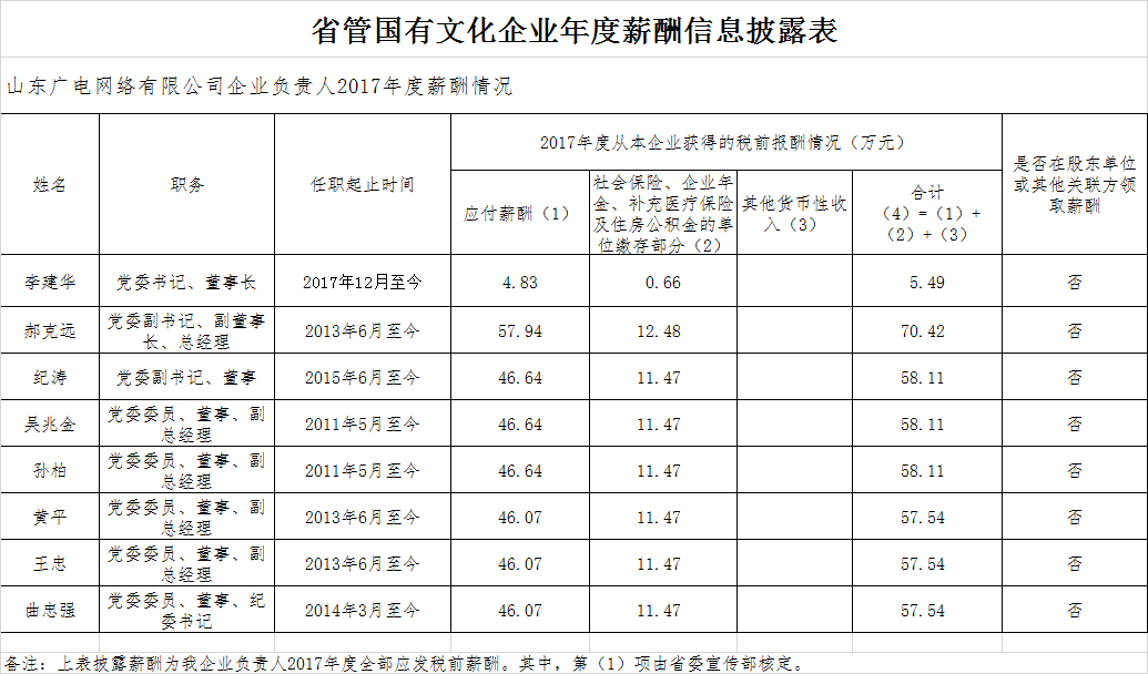 山东广电网络有限公司企业负责人2017年度薪酬情况