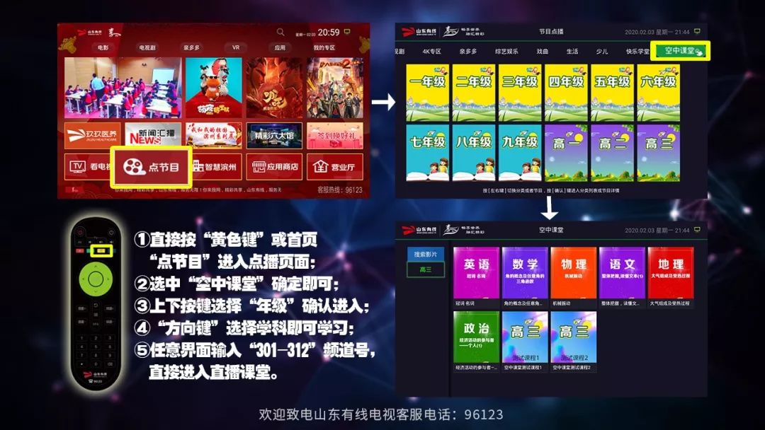 为此,在新型冠状病毒肺炎疫情防控期间,为满足中小学生在家、在线的学习需求,山东有线积极行动,对接各地教育局和学校,及时开启“空中课堂”,在互动点播平台中实时上传各地市教育部门提供的优质免费教辅资源。
