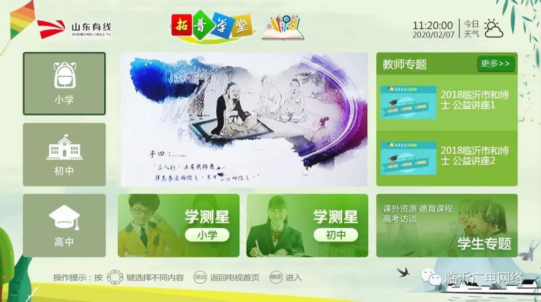 为指导和帮助全市中小学生在2020年春季学期延迟开学期间,科学合理安排好在家学习与生活,做到“停课不停学”,临沂有线应广大师生和家长强烈要求,开设“拓普学堂、学测星”教学电视版,增加教学版块,丰富教学内容,以直播和点播形式免费开通和播出,深受教育部门、师生和家长的欢迎和高度赞赏。