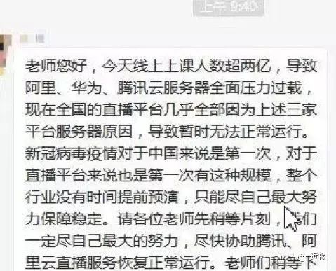 而即便是安装过APP后,2月10日,早上8点全国各地学校集中“开学”,据报告称当天线上上课人数超两亿,导致阿里、华为、腾讯云服务器全面压力过载,全国的网络直播平台因为上述三家平台服务器原因,全部无法正常运行。