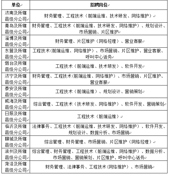 本次招聘涉及市、县公司综合管理、财务管理、法律事务、工程技术(技术研发、前端运维、网络维护)、软件开发、数据分析、市场营销、营销策划、规划设计、片区维护、营业客服、呼叫中心话务等14大类233个岗位。详见附件《招聘岗位及有关要求》。